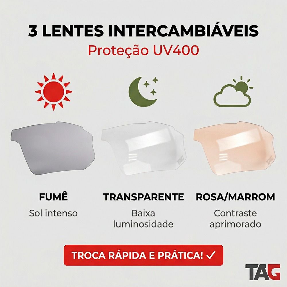 ✅ 3 lentes removíveis com proteção UV 400 para diferentes condições de luz