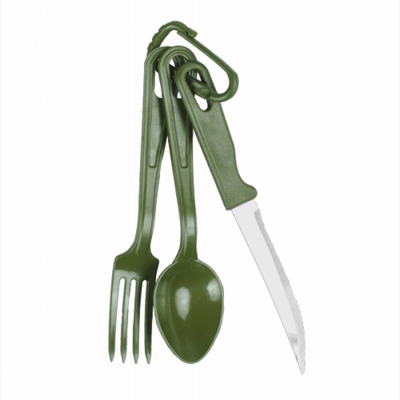 Jogo de talher articulado de ABS, contendo garfo, faca e colher.