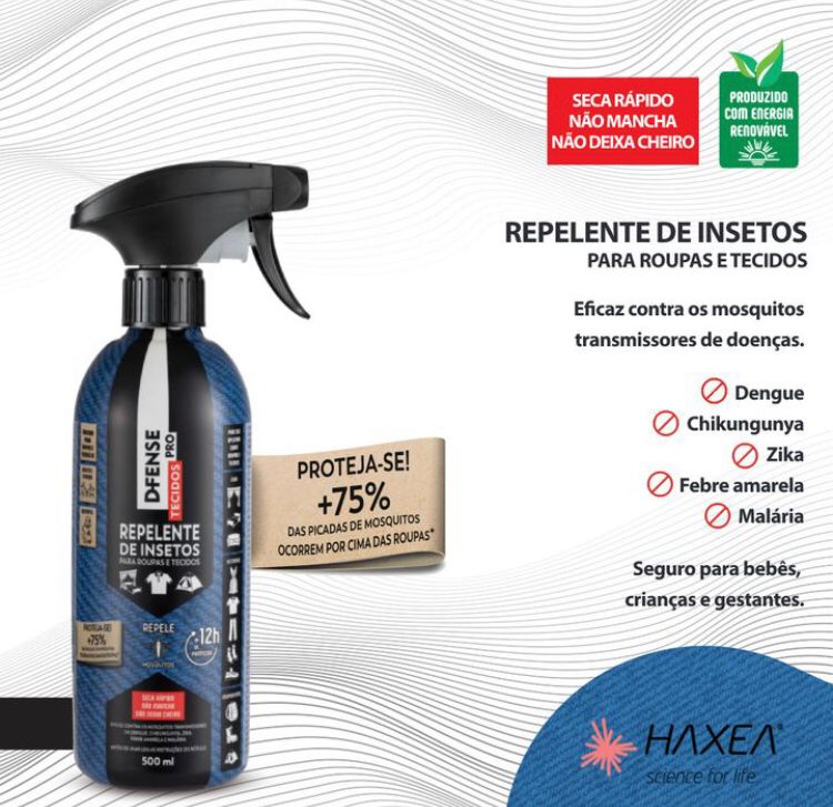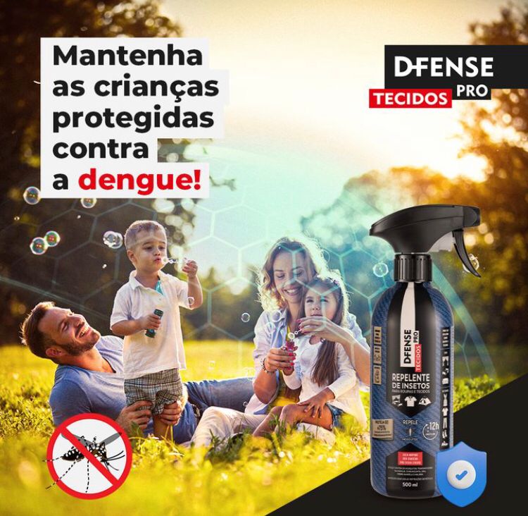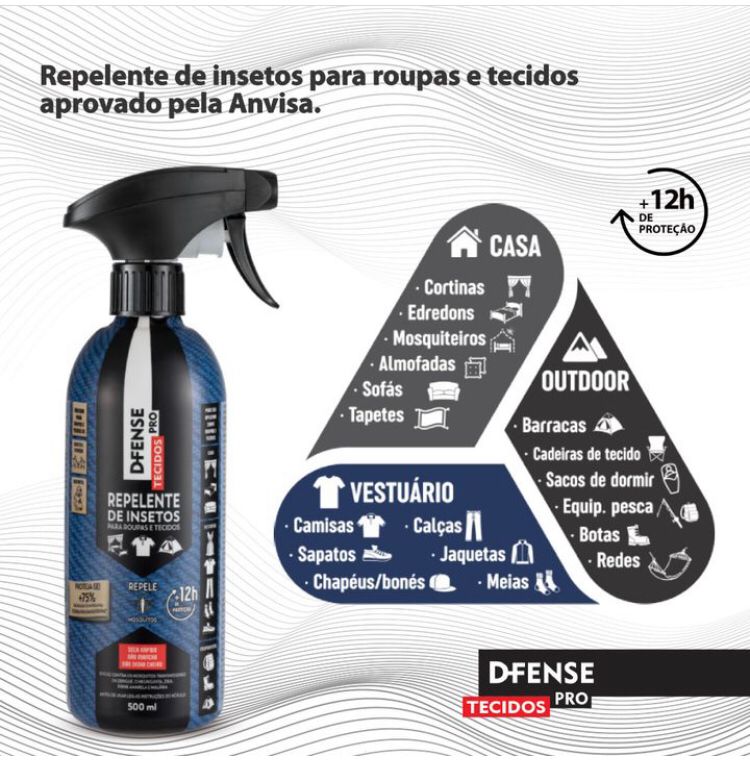 Você sabia que mais de 75% das picadas de mosquitos acontecem por cima das roupas? D-Fense Pro Tecidos é o primeiro repelente para roupas e tecidos aprovado pela Anvisa no Brasil.