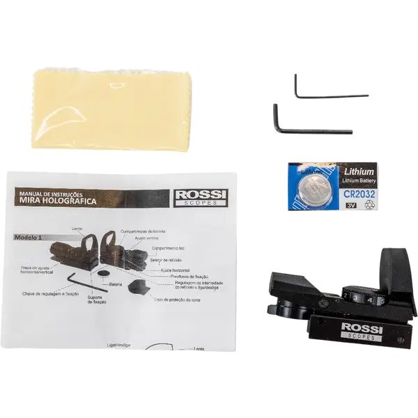 Além disso, a Rossi Multi Retículos 1x22x33 é construída em alumínio de alta qualidade, o que a torna leve e durável. A mira possui ajustes verticais e horizontais, feitos com chave allen, permitindo uma calibração precisa. Compatível com trilhos de 22 mm, a instalação é simples e segura. Alimentada por uma bateria de lítio CR2032 de 3V(não inclusa), a mira oferece longa duração de uso. Com um design compacto e peso de apenas 210 gramas, é uma excelente escolha para quem busca uma mira holográfica eficiente e prática