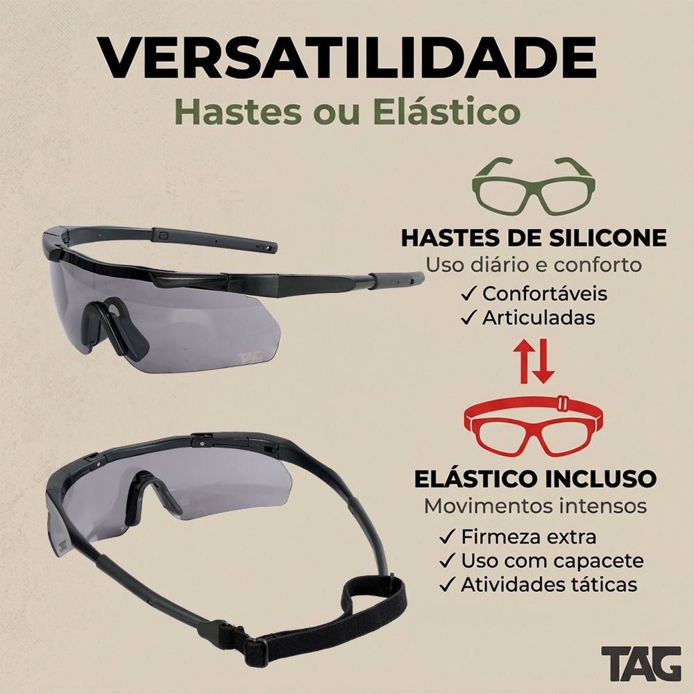 O Óculos Tático TAG Shadow foi desenvolvido para quem busca desempenho em atividades como airsoft, ciclismo, tiro esportivo e aventuras outdoor.
