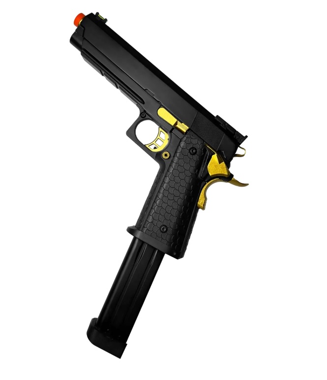 A Pistola Airsoft Double Bell CO2 79A 1911 Hi-Capa é um modelo full metal inspirado na plataforma 1911, que oferece alto realismo e desempenho confiável, com sistema GBB de recuo realista, calibre 6mm, velocidade aproximada de 310 FPS com BBs 0.20g, modo semi-automático e hop-up ajustável para maior precisão; conta ainda com travas funcionais, miras com fibra óptica, magazine para 28 BBs e acompanha maleta rígida, sendo ideal para jogos, treinamentos e colecionadores que buscam qualidade e robustez.