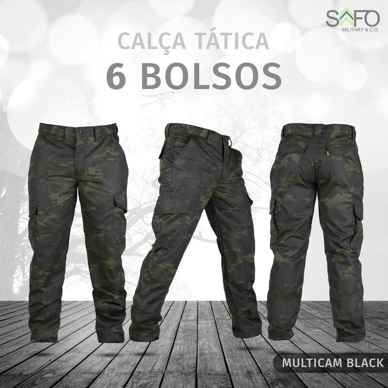 Possui 6 bolsos, sendo 2 bolsos faca, 2 bolsos laterais e 2 bolsos traseiros.