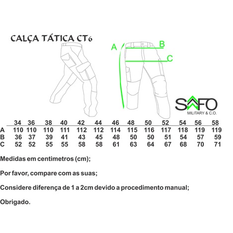 Tamanhos de fabricação 36, 38, 40, 42, 44, 46, 48, 50, 52, 54, 56